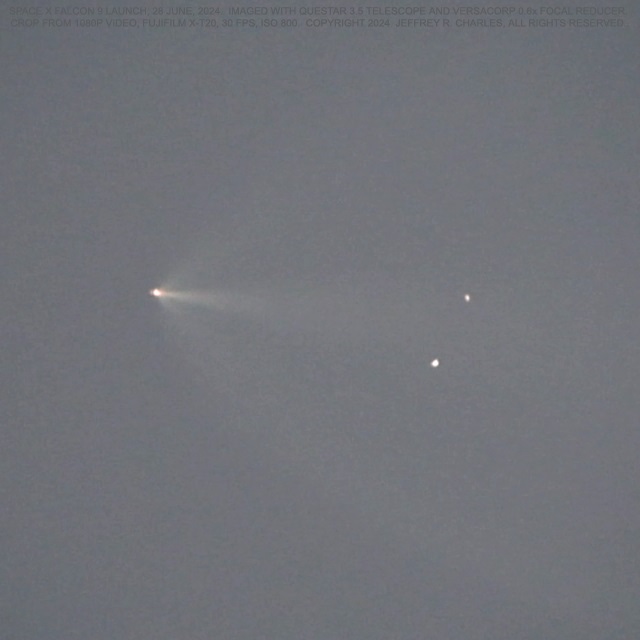 | This photo shows the second stage of the Falcon 9 rocket, shortly after separation of the payload fairings, which are the two small bright objects toward the right. The rocket exhaust plume is now wider and more diffuse because it expands rapidly at high altitude. - Photo is cropped from a 1080p video frame, taken with a Questar 3.5 telescope and a Versacorp 0.6x focal reducer, for a working focal length of about 855mm, f/9.6. The camera is a Fujifilm X-T20 APS format mirrorless, set to ISO 800, 30 frames per second, 1080p. The horizontal field of view for this crop is about 0.5 degrees. - The June launch from Vandenberg SFB was at about 20:14 PDT, so the sky was not very dark. - Copyright 2024 Jeffrey R. Charles, All Rights Reserved. | |