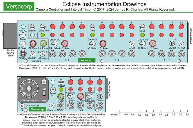 This is a low resolution 640 pixel wide image. Click HERE for a larger image (1560 x 1040, 458 KB). TOP: Twelve Channel Camera Controller and Interval Timer I designed and (partly) built before the 21 Aug. 2017 total solar eclipse. The red circles immediately below the channel numbers (1 through 12) are pushbuttons that can manually fire the corresponding cameras, in the event that it is desirable to take pictures at times other than the set interval. The smaller red circles below these are indicator LED's for each channel. When the controller is on, the LED's are on all the time, except for going out for about 1/3 of a second to indicate when a photo is taken. - To the left of each set of four buttons is a momentary toggle switch that manually fires all four channels to its right. Farther left is a master switch that fires all 12 channels at once. - All of the Clock Select toggle switches have a center off position, so any set of four cbannels can be independently disconnected from the interval timer, for manual operation. The master clock select also has a center off position. - Channels 9-12 have a divider that can be selected and set to rates of 2 and 4 times slower than the other channels. The divider is mainly for use with film cameras, where the slower rate will prevent running out of film before the eclipse is over. For example, if the other channels are set to 4 seconds, but channels 9-12 are set to 16 seconds, a 36 exposure roll of film will last 9 minutes and 20 seconds, or 35 times the interval. (It is not 36 times the interval because a photo is taken at the beginning of the first 16 second interval.) - Jacks for the camera cables are in the bottom row. These were kept on the front side of the controller so it would be more obvious which channels were connected to cameras or other devices. - Due to lack of time (reasons are in my 2017 eclipse journal), it was only possible to complete the first four channels, and I added a modified Contax interval timer to the left side, to save the time it would have taken to build the continuously variable internal timer. The Contax timer was retained long term because its simple interface is marked in discrete inteval times in seconds. However, it was modified to provide the longer pulse duration that some digital cameras require. This 12-channel unit is too large to be practical for luggage I could handle on a foreign trip. BOTTOM: This smaller version only has four channels, but that is adequate for a traveling setup because it is unlikely that more than four still image cameras would need to be automated anyway. - However, it is possible that one of the channels would be used to turn on a light meter at regular intervals, as part of acquiring data for a light curve. That would only leave three available channels for cameras. - In this version, only channel 4 and the clock out jack can utilize the divider to slow their rate in relation to the first 3 channels. This is useful for film cameras, to reduce the risk of running out of film. - Electronic parts proved to be expensive. In 2017, it cost over US $900 to acquire the relays, switches, and other parts needed to build the 12 channel camera controller above, but some of this cost was due to minimum quantities of certain items that had to be purchased. Also, a few alternatives for potentially long lead time parts were acquired, but only a few of those had to be used. The only item that was not bought new was the small Contax interval timer, to use as a stop gap (then a permanent selectable) clock. For the smaller version of the camera controller, the parts cost thus far is $200 and counting. Even though I have been buying parts for the smaller controller, I probably won't start building it unless my health and other circumstances make it look like there is some prospect of making it to a future eclipse. Copyright 2024 Jeffrey R. Charles, All Rights Reserved. | |