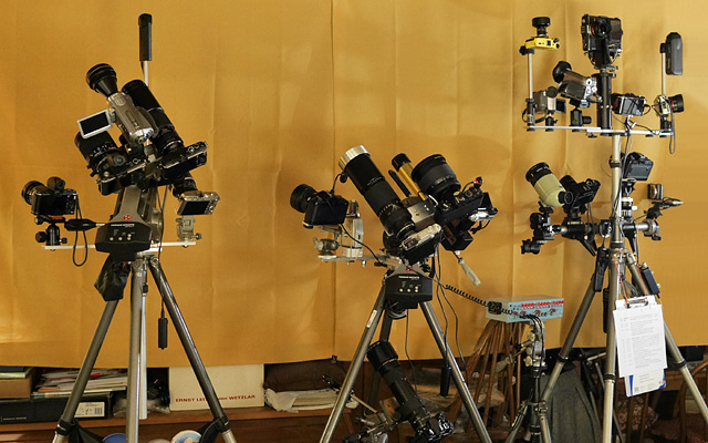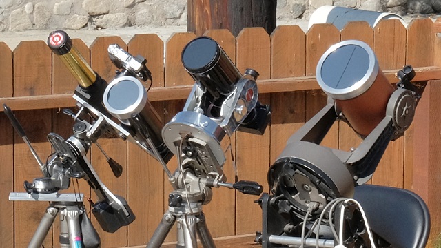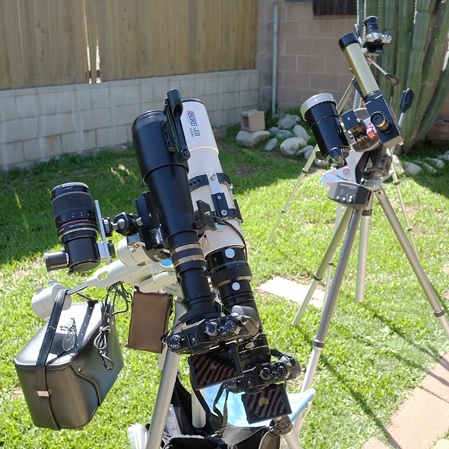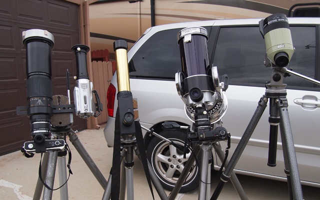 From right to left: 1.) Celestron C5 with 16mm Nagler eyepiece, used visually and for afocal video. 2.) Questar Duplex 3.5 with Fujifilm X-T10 camera, for photos. 3.) Ad Astra III telescope and Panasonic GX7 camera, for video. 4.) Coronado PST telescope with Barlow and Panasonic GX7 camera, for photos and video. - All of the telescopes except the Coronado PST have front solar filters. | |