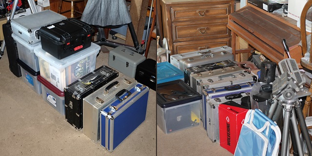 The scaled back eclipse instrumentation below is lighter and requires less volume than the 2024 eclipse setup, but it is about 21 kg heavier than my 1995 eclipse setup. This is partly because the 1995 setup had only one corona video camera and one corona still camera, and neither was on a tracking mount. Also, for an average eclipse trip back in the day, film cameras did not need chargers or spare batteries, and there was no need to bring a computer to view film photos. As in 1995, a photo vest with numerous pockets is proposed, to provide a way to carry small and light things that may need to be accessed quickly. A soft tripod case is also included, to make it possible to carry the largest tripod separately when traveling by means other than air. The proposed assembly or item weights (in pounds) in the notional future eclipse setup (not counting three optional cameras) are as follows: (PROPOSED) FUTURE ECLIPSE EQUIPMENT WEIGHT: ITEM (Quantity): WEIGHT: EQUIPMENT IN LUGGAGE: Fuji X-T10 camera (2) 2 Fuji X-T20 camera (3) 3 Nikon N2020 camera (1) 2 Pana. GX7 (3) 3 Ricoh Theta, Acc. 1 Extra Bat./Chargers 2 Laptop Comp/PS/Plug Ad. 5 CAMERA/COMPUTER TOTAL: 18 lbs Entaniya 3.6mm 4 Samyang 7.5 f/3.5 (2) 1 Samyang 8.0 f/2.8 (1) 1 7Artisans 28 f/1.4 1 Fuji System 2, in case 6 (-3, since cam./lenses counted separately) AdAstra 3 w/cam. adapt. 3 Rokin. 300 telescope 1 TeleVue 60 w/case 5 Nikon 300/4.5 ED 3 Tamron 500/8, 1.4x 2 Solar Filters (5) 1 Binoculars (10x25) 1 OPTICS TOTAL: 26 lbs Meter/Clock w/Sup.Bar 2 Interval Timer (4 chan) 1 Fornax 1 + Wedge 4 Fornax 2 + Wedge 4 Counterweight f/Fornax 2 AA+9V Batteries 1 INSTRUMENT TOTAL: 14 lbs LeapLumin BallHd (4x) 2 Slow Motion Head (2x) 2 Gitzo 1270 head 2 Gitzo 1370 head 3 Gitzo Reporter 206a 4 Gitzo Reporter 206b 4 Gitzo MiniStudex 302 5* Not Counted (Alternate for Reporter 206b) Gitzo Studex 306a 6 Gitzo Reporter cane (2) 3 Wide A. Cam Bar/Posts 4 CamCrossBar, 8.5" (2) 1 Fisheye RA Bracket 1 Tripod Apron 1 SUPPORT TOTAL: 33 lbs EQUIPMENT TOTAL: 91 lbs. LUGGAGE, CLOTHES, EXTERNAL: Rolling Bag 1 (Telesc.) 8 Rolling Bag 2 (Tpd,Brk) 8 Rigid Box for Entaniya 2 Computer Bag 1 (Cam's) 3 Computer Bag 2 (Lenses) 3 Soft Tripod Bag 1 Photo Vest (Domke) 2 Extra Clothes 5 Cleaning Supplies 1 Food, Water, Bowl, Etc. 5 TOTAL NON-EQUIPMENT: 38 lbs TOTAL, ALL ITEMS: 129 lbs (12.9 lbs per camera used.) Reducing Eclipse Equipment Weight and Volume at Expense of Reduced Capability: In the above list, only a few things can be removed without having a significant impact on the capability and performance of the eclipse system. A few examples are shown below, to illustrate that the total weight is not reduced enough to make much difference, even when a change (such as not bringing the Entaniya 250 degree fisheye lens or any actual telescopes) will cause major reductions in function. Also, leaving out a computer would make it difficult to view or back up photos and data during the trip. CHANGES VERSUS SYSTEM WEIGHT: POTENTIAL WEIGHT REDUCTIONS: Use 7Artisans 4mm fisheye instead of Entaniya 3.6mm: -5 lbs Lighter brackets and posts for Wide Angle assembly: -2 lbs Replace Sekonic meters w/Gossen DigiSix, lighen brackets: -1 lb Use 600mm mirror lens instead of AdAstra telescope: -1 lb Replace TeleVue 60 telescope w/Tamron Nestar 400mm lens: -3 lbs Replace 300mm ED Nikkor with Olympus 75-300mm MFT lens: -2 lb Use Omegon MiniTrack LX4 mounts instead of Fornax mounts: -4 lbs Replace corona still counterweight with offset bar: -2 lbs Do not bring a laptop computer/AC power supply on trip: -5 lbs Replace 2 rolling carry on bags w/backpacks & trolleys: -8 lbs Replace both computer bags with NL Bento bag or similar: -3 lbs TOTAL weight reduction from from lightweighting: 36 lbs ...which reduces the total weight to: 129-36 = 93 lbs Even though the above only reduces the total weight by 36 lbs, it could be enough to reduce the total number of bags from 4 to 3, especially if the largest bag is close to the weight limit for a checked bag. However, a large rigid case suitable for a checked bag could weigh at least 12 pounds, and only 4 pounds of this would be offset by removing one backpack with its collapsible trolley. A Lot of Lightweighting Comes to Naught if Airlines Require Checking In a Carry-on Item: Unfortunately, when the eclipse instruments are painstakingly optimized for air travel that utilizes only one checked bag, plus one fully compliant carry on bag and one fully compliant personal item bag, the carry on and personal item bags cannot include enough padding for the equipment to survive if either item is checked. This means that an entire eclipse expedition could be blown away (and thousands of dollars of damage done to equipment) if an airline employee arbitrarily says that either carry on item has to be checked. On certain airlines, I'd rarely had a flight where it wasn't a struggle to be allowed bring even the two compliant carry on items, though it was generally less of a problem when well dressed at the airport. (Clothes should not matter, since even some of the 9/11 attackers were well dressed, but many seem to judge a book by its cover.) But some airlines that seemed to discriminate the most based on attire, etc., back in the 1990's - are no longer in business. Uncertainty over safely transporting delicate equipment in even fully compliant carry on items is a major reason why I have not flown to an eclipse since 1995. Also, on every international trip except one, my checked bags didn't even arrive on the same day as my flight! And checked baggage that is late (especially over a day late) severely complicates an eclipse trip. I'd strive for an (expensive) eclipse setup that could fit entirely into a compliant carry on and a compliant personal item bag (so it would not require any checked bags), if not for the fact that all of this work and expense would be undone if an airline employee arbitrarily prevented carrying on both compliant carry on items. All that work wou