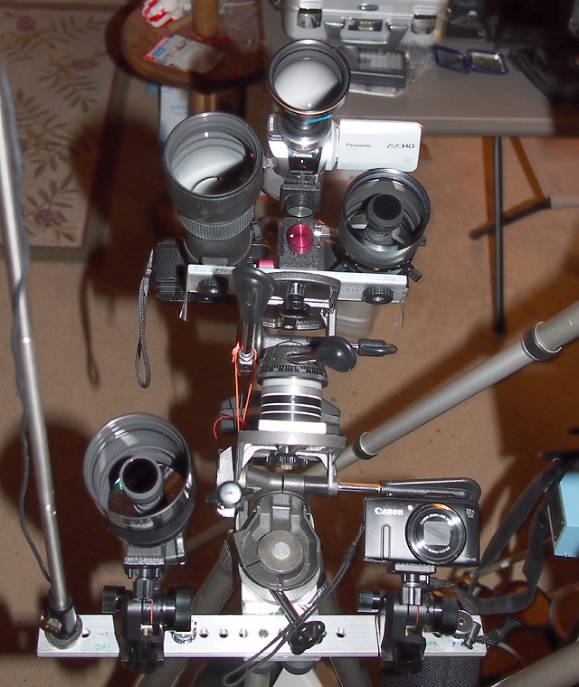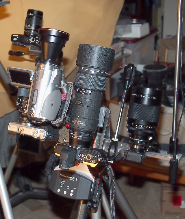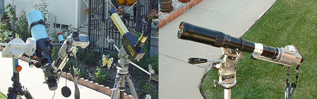 From left to right: 1.) Vernonscope 94mm f/7 refractor with afocal adapter (uses 48mm Brandon eyepiece) and Sony DSC-F707 camera. 2.) Coronado PST Hydrogen-Alpha solar telescope (used visually and for photos). 3.) Soligor 450mm f/8 lens with the same custom afocal adapter that I made for the telescope. The custom afocal adapter can be used on larger telescopes with an 85mm f/1.8 camera lens instead of the "eyepiece." | |