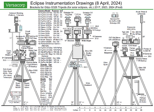 | Images below include a drawing of the equipment that was envisioned (and completed) for the 8 April 2024 total solar eclipse. Photos (some of which are below; more to be added later) show the actual equipment in its completed state. Completing this setup required a lot of time and effort, not to mention cost and other aspects. Completing it was made a great deal more difficult by the fact that I had to take on being Power of Attorney for an incapacitated elderly friend for three years, starting in late 2020. That literally required almost all of my time and energy for those three years.