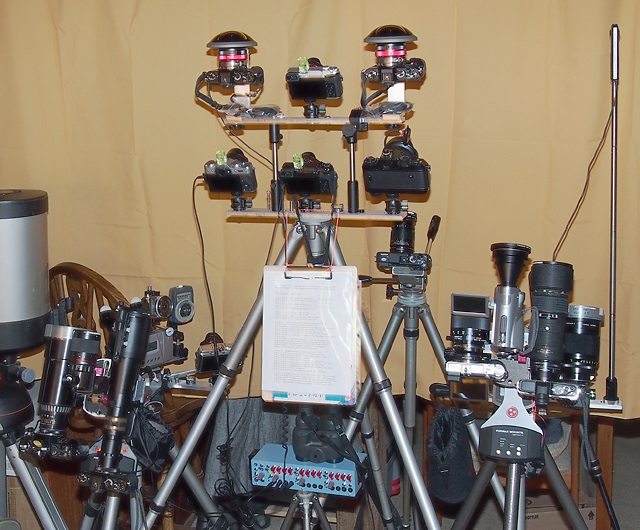 From left to right: 1.) Celestron C5 with 16mm Nagler eyepiece, used visually and for afocal video. 2.) Questar Duplex 3.5 with Fujifilm X-T10 camera, for photos. 3.) Ad Astra III telescope and Panasonic GX7 camera, for video. 4.) Coronado PST telescope with Barlow and Panasonic GX7 camera, for photos and video. 5.) Not shown: Ednar Mirror Scope 500, to observe the transit while the other instruments are tied up. - An atomic clock is in the background. | |