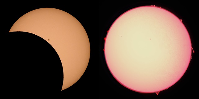LEFT: Maximum Eclipse from Los Angeles, CA. 8 April, 2024 (Visible Wavelengths). RIGHT: Prominences of 8 April, 2024, imaged in Hydrogen Alpha through Coronado PST. (Triangular prominence near bottom was visible naked eye to many in the path of totality.) |