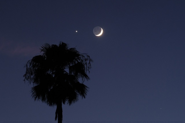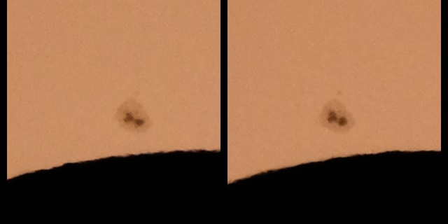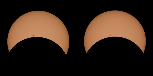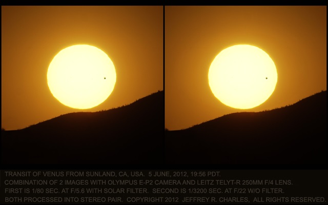 Some processing was required on one of the two images to make this 3D stereo image of the Venus transit of 5 June, 2012. One of the photos is a stack of a 1/80 second and 1/3200 second exposures that is not processed beyond stacking and adjusting contrast and brightness. In the other image, the sun was shifted slightly to one side, then Venus was shifted an even smaller amount. The motion of Venus in front of the sun can cause a pair of images to work as a stereo pair without any processing at all, but only when they are rotated so that the motion of Venus will be purely side to side in the photos. However, the relative motion of Venus would be in a diagonal direction at sunset. The original photo was taken with an Olympus E-P2 Micro 4/3 camera and a Version 1 Leitz Telyt-R 250mm f/4 lens. The exposures are 1/80 sec. at f/5.6 and 1/3200 second at f/22, with no solar filter. Taken from Shadow Hills, CA. | |