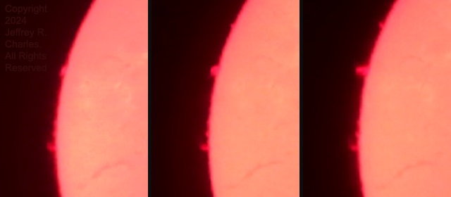 | LEFT: Partial Solar Eclipse from Los Angeles. Maximum eclipse was only about 50 percent of the solar diameter, and far less in area. My trip to the path of totality was prevented by an extended outage of both Frontier phone and Internet service, at the critical time when I was trying to arrange a group trip. (I was unable to make the long drive by myself.) RIGHT: Solar prominences of 8 April, 2024, imaged with Coronado PST 40mm aperture Hydrogen-Alpha telescope immediately after the end of the partial eclipse. The large triangular prominence was close to where the "diamond ring" effect occurred at third contact (the end of totality) for people near the center of the path of totality. Comment: These images are oriented more or less according to celestial north, rather than the apparent orientation of the sun from Los Angeles. Why the moon appeared to move from southwest to northeast (in celestial coordinates), and not purely west to east, is covered in the "Partial Solar Eclipse Images" chapter, linked in the Table of Contents below. |