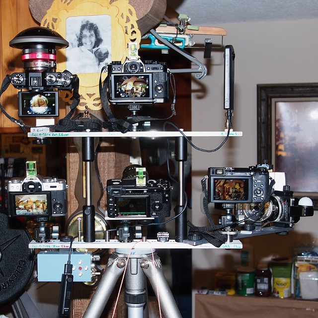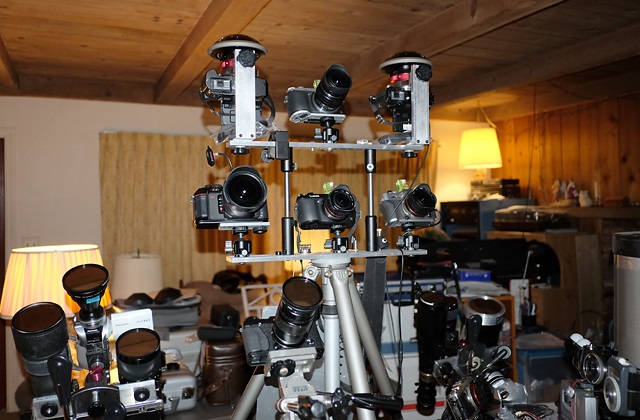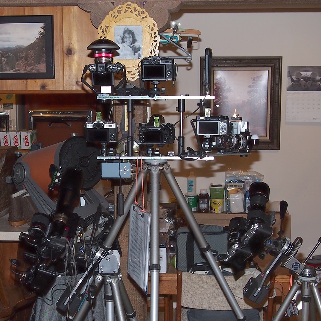 ADDED ITEM (Quantity): WEIGHT: EQUIPMENT IN LUGGAGE: Spare Nikon N2020 1 Motorized Pano Platform 4 (Optional) Optional Tripod Leveler 2 (Optional) TOTAL EXTRA IN LUGGAGE 7 Elevated Mount for Pano 4 ADDIT. SUPPORT TOTAL: 4 lbs LUGGAGE, CLOTHES, EXTERNAL: Entaniya Lens cases (2) 6 (Added weight, after subtracing 2x 2 lb boxes) Rigid Camera case 1 6 Rigid Camera case 2 4 Fornax Mount case 1 4 Camera Bracket Case 6 Plastic File Boxes (4) 8 TOTAL NON-EQUIPMENT: 34 lbs WEIGHT OF ABOVE ITEMS: 45 lbs WEIGHT OF 2024 LIST: 194 lbs TOTAL WT, 2024 EQUIP: 239 lbs At 14.9 lbs per camera used, the grand total weight for the 16 camera system is more per camera than the scaled back system. However, the 239 lb grand total for the "as packed" 2024 eclipse setup (which was intended for ground transport only) was not for a system intended to be lightweight. The 2024 grand total also further includes two additional cameras: A spare Nikon N2020 (for using a second type of film if time permits), and a film camera with a wide angle lens for taking pictures of subjects other than the eclipse. When these other cameras are counted, the per-camera 2024 system weight is 13.3 pounds. In addition to the 2024 equipment weight shown above, I had packed personal items such as a food bowl, toothbrush, etc., in a separate train case, rather than mingling such items with the equipment. And I was bringing more food, water, etc., than would be the case if traveling by air. That probably added at least another 10 pounds to the above 239 pound 2024 eclipse equipment total.