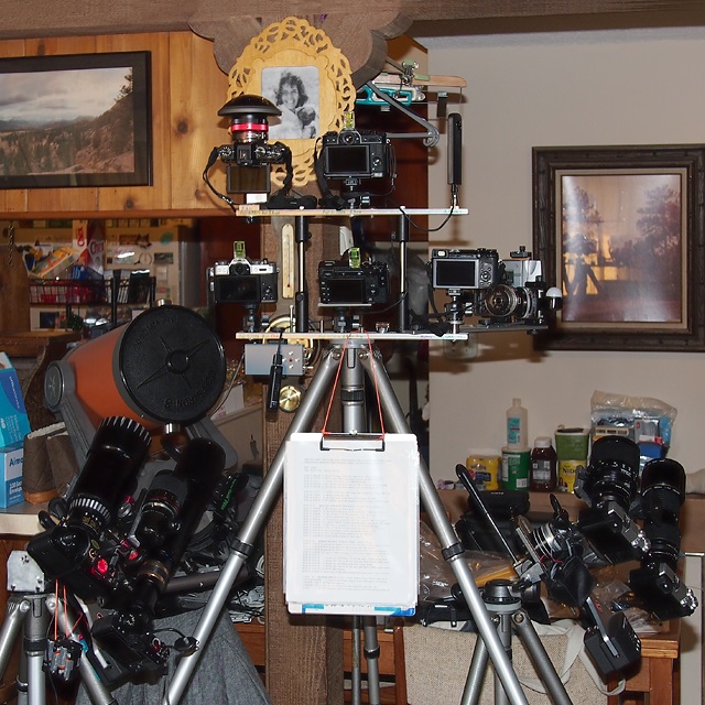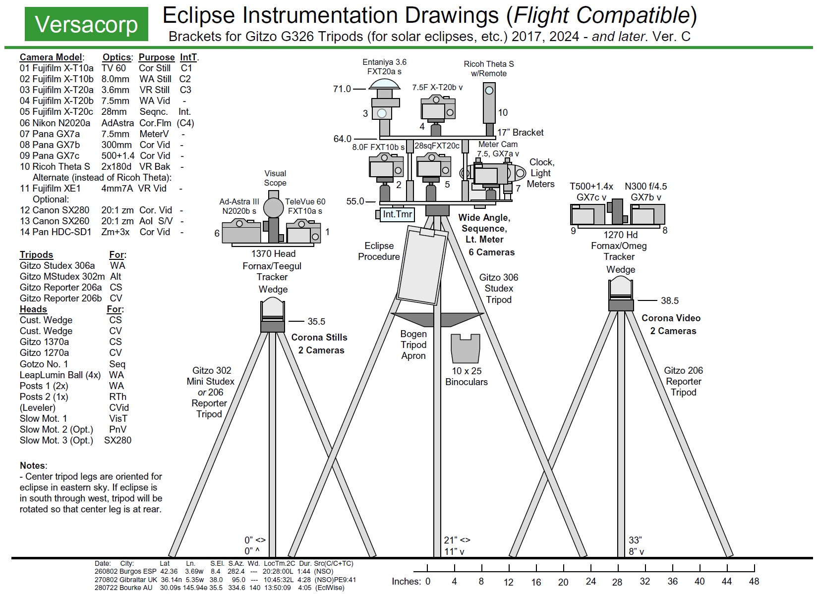 Comparing Notional Future Eclipse Equipment with the 2024 Eclipse Setup: When reducing the weight of eclipse equipment, there is a diminishing return to reducing the number of cameras without also giving up capabilities such as tracking. Even when the tripod size is reduced and a few brackets are eliminated, it does not eliminate the fixed weight of a star tracker, light meter, or other supporting equipment. The list below shows items from the 2024 setup that are not in the smaller setup above. As the weight totals will show, the reduction in weight is not quite proportional to the reduction in the number of cameras: