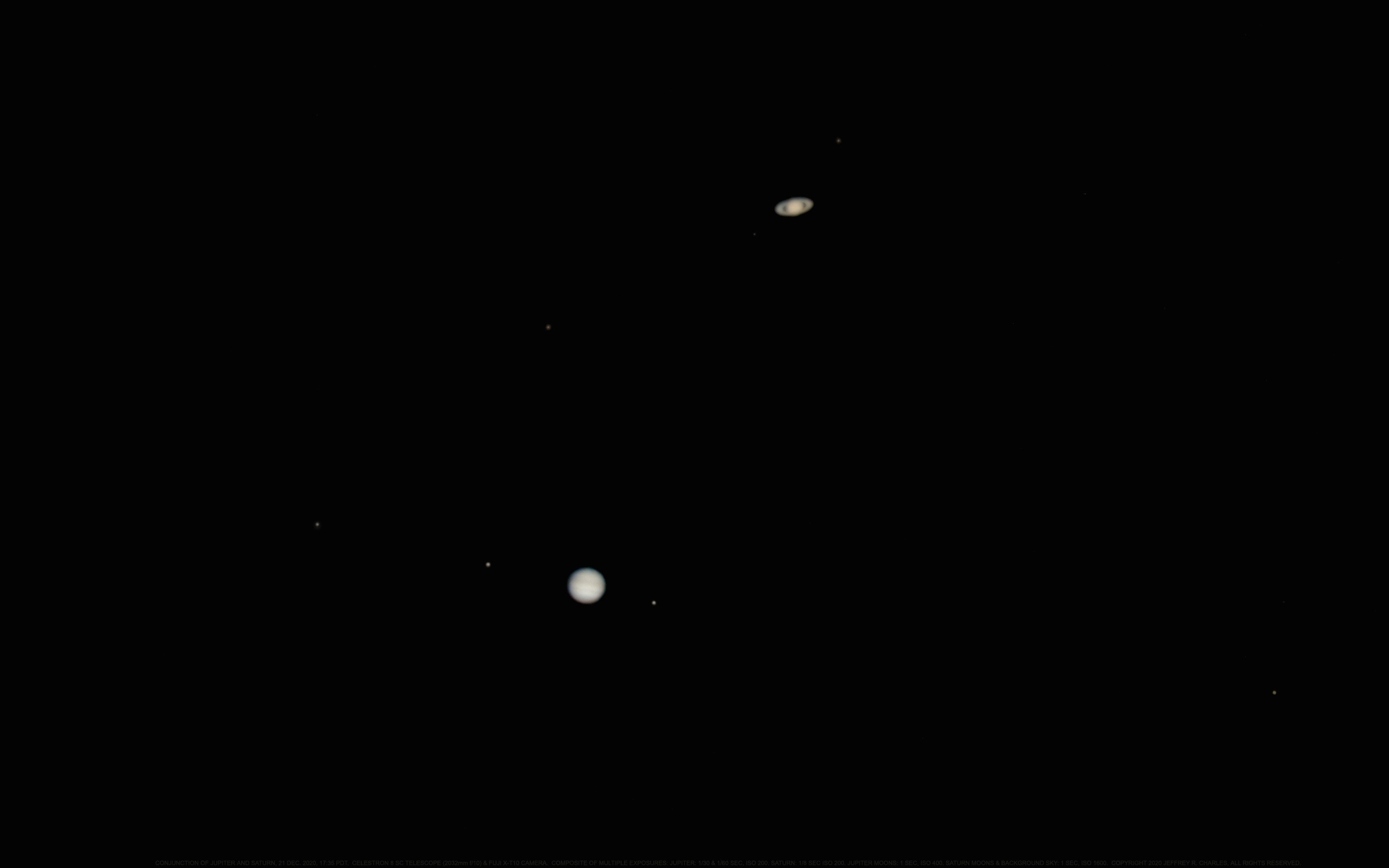 Click HERE to view a larger image of this 2020 conjunction (2560 x 1600, 195 KB) Comments: I wanted to set up more than one telescope for such a rare event, but was extremely fatigued with what turned out to be the beginning of weeks of illness and a month of self quarantine from Long COVID. I would have later been hospitalized from related breathing problems if hospitals had not been full. (For almost all of 2020, I had only gone out once or twice a month for necessities and wore both a mask and gloves, but caught it at the grocery store anyway.) The preoccupation with breathing that it caused has to be experienced first hand to be appreciated. | |