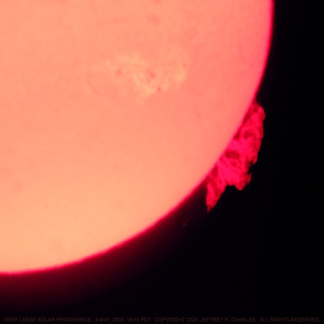 | Bright 300,000 KM Wide Solar Prominence of 9 May, 2024, 18:15 PDT. | |
