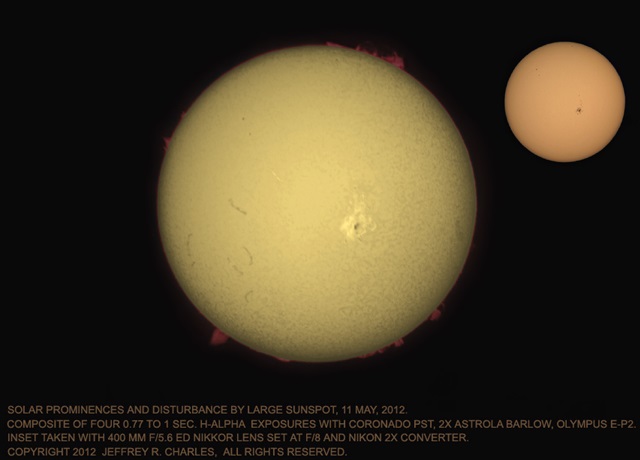 | Solar prominences in Hydrogen-Alpha, plus Hydrogen-Alpha surface detail, through a Coronado PST solar telescope. Composite of four 0.77 to 1 second exposures. The front end of a 2x Astrola Barlow lens was used on the 1.25 inch camera adapter to provide enough back focus for an Olympus E-P2 camera. The visible light image at upper right was taken with the same camera, using a 400mm f/5.6 ED Nikkor lens with a Nikon 2x converter and a solar filter. | |