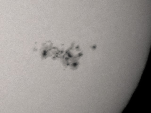 | White Light Photo of Sunspots in Active Region AR3664 on 9 May, 2024, 18:35 PDT. | |