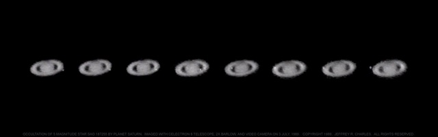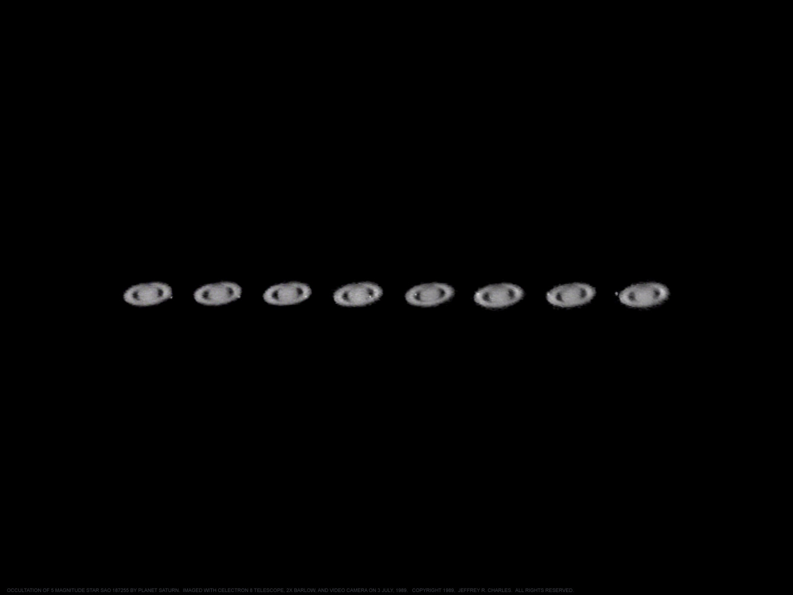 | Occultation of a 5th Magnitude Star SAO 187255 by the Planet Saturn. 3 July, 1989. Video was taken of the entire event, using a Celestron 8 SCT telescope and a 2x Barlow lens with a 1/2" format monochrome Amperex frame transdfer CCD video camera. Images here are frame grabs from the video, via a late 1990's era SnapMagic frame grabber. Copyright 1989, 1999, 2025 Jeffrey R. Charles, All Rights Reserved. Click HERE to view a larger image of this 1989 occultation sequence (1600 x 1200, 77 KB) | |
