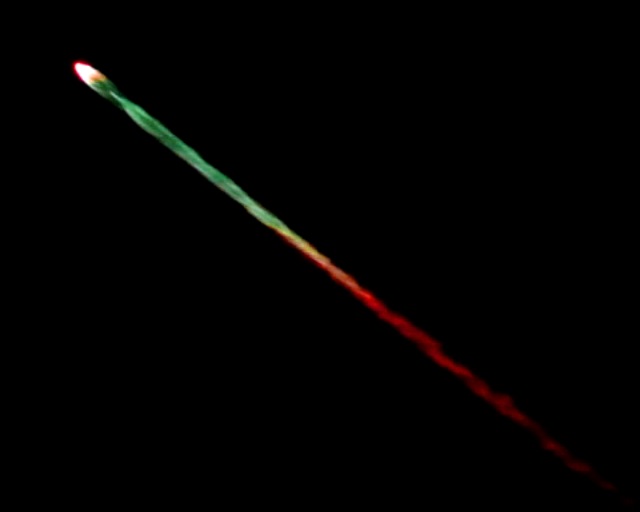 | This photo shows the Falcon 9 booster stage reducing thrust immediately before staging. The plume had a very strong orange-red color until right before this time. I am not sure what caused the dramatic change in the plume color, since none of the plume was in sunlight and it was not at a low elevation angle. After staging, the second stage was imaged only as a small orange dot, since its plume was too dim to image at night with the equipment I was using. However, the expanding second stage plume could just barely be seen visually. - Lauched from SLC-4E, Vandenberg Space Force Base, CA, this mission was Starlink 11-1, which launched a batch of 23 Starlink satellites to low earth orbit (LEO). - Photo is cropped from a 1080p video frame, taken with a Nikon 300mm f/4 lens, used at f/4.8. The camera is a Fujifilm X-T20 APS format mirrorless, set to ISO 3200 and 30 frames per second at 1080p. Tracking was by hand, using a Bogen fluid head. The horizontal field of view for this crop is about 1.5 degrees. About two weeks before this launch (during the third week of Frontier's LONG July outage), I switched my Internet service to a different provider. Therefore, I at long last had a working Internet connection to look up when the launch was scheduled. - Copyright 2024 Jeffrey R. Charles, All Rights Reserved. | |
