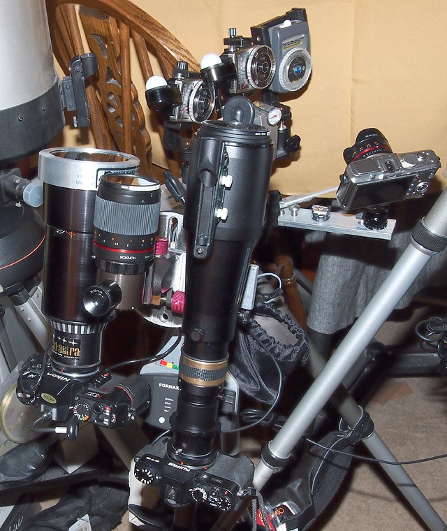 From left to right: 1.) Vernonscope 94mm f/7 refractor with afocal adapter (uses 48mm Brandon eyepiece) and Sony DSC-F707 camera. 2.) Coronado PST Hydrogen-Alpha solar telescope (used visually and for photos). 3.) Soligor 450mm f/8 lens with the same custom afocal adapter that I made for the telescope. The custom afocal adapter can be used on larger telescopes with an 85mm f/1.8 camera lens instead of the "eyepiece." | |