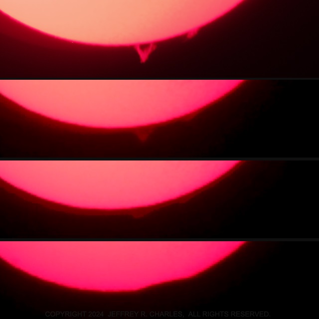 This sunspot group in Active Region (AR) 3664 was imaged with an Ad Astra III 78mm f/9.75 Maksutov-Cassegrain telescope and a white light solar filter. Color saturation was reduced to remove the orange cast from the filter. The photo isn't particularly sharp because the sun was at a low elevation angle. This sunspot group is probably close to a tie with the third or fourth largest sunspot group I ever observed. Taken on 9 May, 2024 at 18:35 Pacific time with a Fujifilm X-T10 camera working at ISO 800. Exposure is 1/125 second at f/9.75, through a solar filter. This is one region of the sun that made the news that week. The prominences pictured above are not associated with this region. They are instead associated with regions that are closer to, or even on, the solar limb. Photo taken from Shadow Hills, CA. Copyright 2024 Jeffrey R. Charles, All Rights Reserved. | |