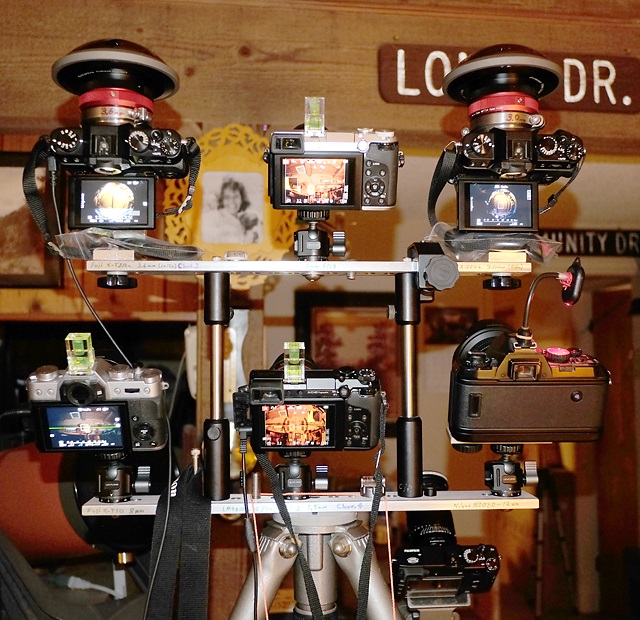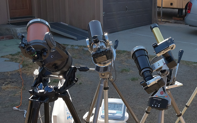 From right to left: 1.) Celestron C5 with 16mm Nagler eyepiece, used visually and for afocal video. 2.) Questar Duplex 3.5 with Fujifilm X-T10 camera, for photos. 3.) Ad Astra III telescope and Panasonic GX7 camera, for video. 4.) Coronado PST telescope with Barlow and Panasonic GX7 camera, for photos and video. - All of the telescopes except the Coronado PST have front solar filters. | |