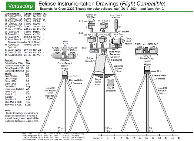 ADDED ITEM (Quantity): WEIGHT: EQUIPMENT IN LUGGAGE: Spare Nikon N2020 1 Motorized Pano Platform 4 (Optional) Optional Tripod Leveler 2 (Optional) TOTAL EXTRA IN LUGGAGE 7 Elevated Mount for Pano 4 ADDIT. SUPPORT TOTAL: 4 lbs LUGGAGE, CLOTHES, EXTERNAL: Entaniya Lens cases (2) 6 (Added weight, after subtracing 2x 2 lb boxes) Rigid Camera case 1 6 Rigid Camera case 2 4 Fornax Mount case 1 4 Camera Bracket Case 6 Plastic File Boxes (4) 8 TOTAL NON-EQUIPMENT: 34 lbs WEIGHT OF ABOVE ITEMS: 45 lbs WEIGHT OF 2024 LIST: 194 lbs TOTAL WT, 2024 EQUIP: 239 lbs At 14.9 lbs per camera used, the grand total weight for the 16 camera system is more per camera than the scaled back system. However, the 239 lb grand total for the "as packed" 2024 eclipse setup (which was intended for ground transport only) was not for a system intended to be lightweight. The 2024 grand total also further includes two additional cameras: A spare Nikon N2020 (for using a second type of film if time permits), and a film camera with a wide angle lens for taking pictures of subjects other than the eclipse. When these other cameras are counted, the per-camera 2024 system weight is 13.3 pounds. In addition to the 2024 equipment weight shown above, I had packed personal items such as a food bowl, toothbrush, etc., in a separate train case, rather than mingling such items with the equipment. And I was bringing more food, water, etc., than would be the case if traveling by air. That probably added at least another 10 pounds to the above 239 pound 2024 eclipse equipment total.