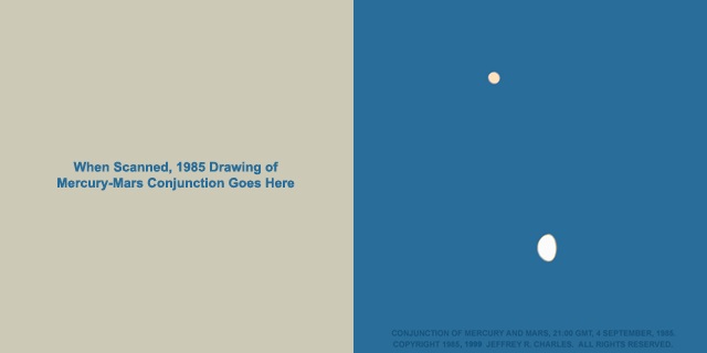 LEFT: My 1985 drawing of the conjunction is on the left. It shows the motion of Mars relative to Mercury during the observations. The pair was less than 30 degrees from the sun, so I used the roof of a covered patio to shield the front of the telescope (a Celestron 8 SCT) from the sun. The observation was made at 112x magnification, and the drawing shows the central 1/4 of the eyepiece field width. Mercury appeared to be about half illuninated, so I drew it that way. RIGHT: However, when I used software to simulate the conjunction over a decade later, the software showed Mercury in a decidedly gibbous phase. An image based on the software rendering is on the right. At the time, this made me second guess the phase in my decade-plus old drawing, but I went with the software version of the conjunction for one of my books. Seeing was not that bad during the observation, so I'm not sure why my 1985 drawing shows Mercury in a slightly different phase than the software later showed. Copyright 1985, 1999 Jeffrey R. Charles, All Rights Reserved. | |